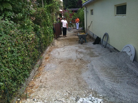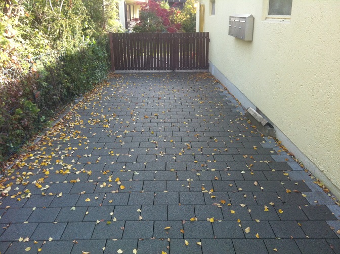 Objektzufahrt: neu gestaltet, drei befahrbare Parkplätze erstellt, Tor umgebaut, versetzt und dem Kundenwunsch entsprechend mit Leerrohr und Elektrokabel vorinstalliert.